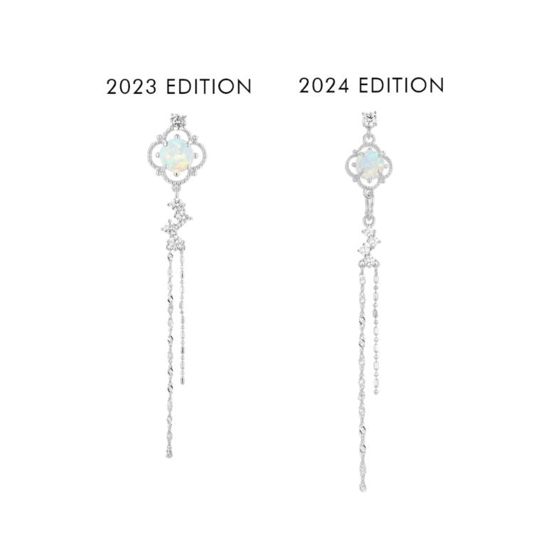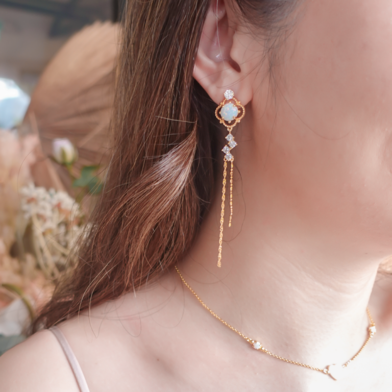 Iris means “rainbow”, reflecting the rainbow hue from the opal. This design is inspired by clover leaf, symbolizing luck, hope and faith for the wearer. Iris earrings are perfect for adding a touch of elegance and glamour to any outfit as it dangles down along your face line. This is designed to be versatile, it can be worn with the studs alone, or you can wear as a dangling earring too.