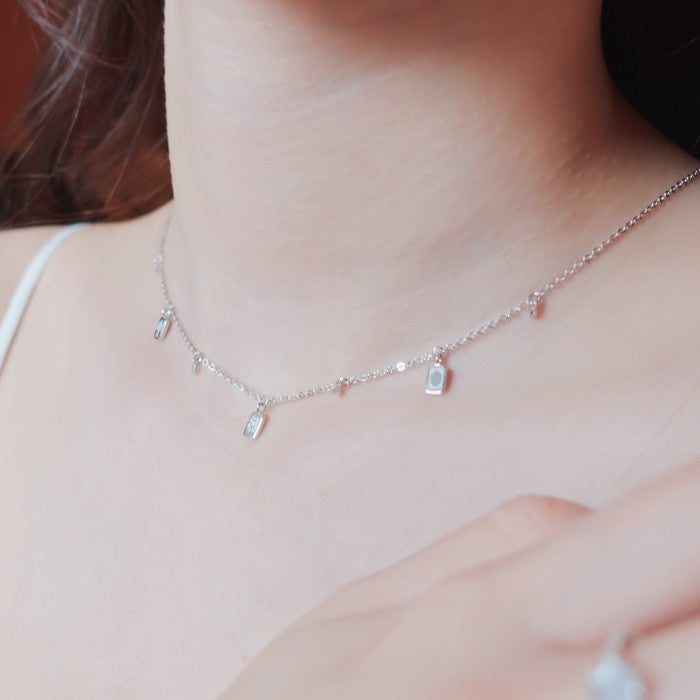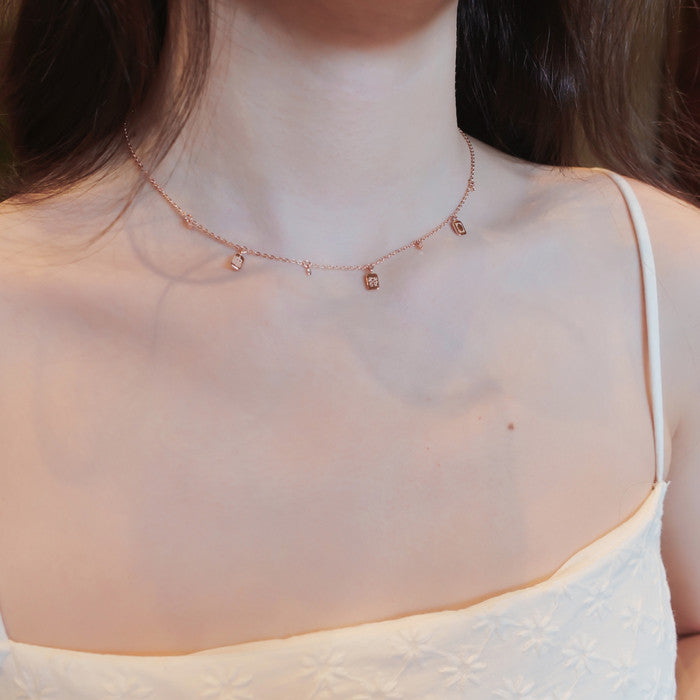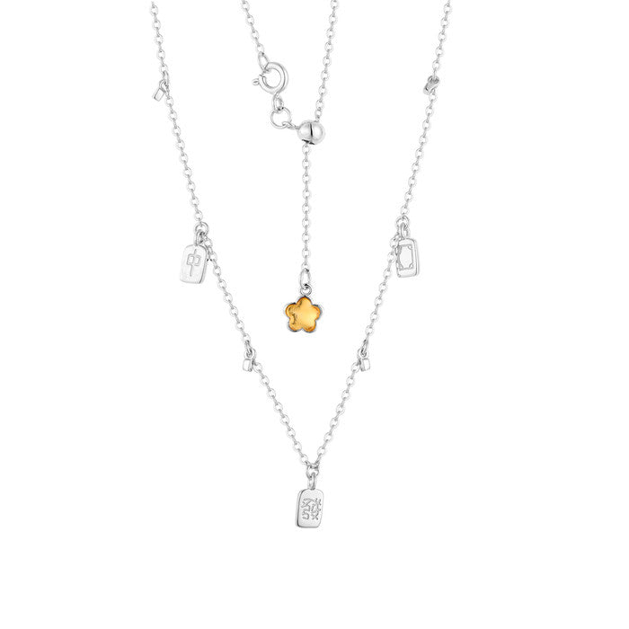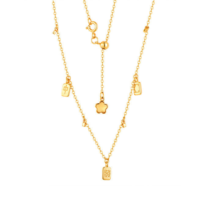 大三元 Necklace has 3 mahjong mini tiles – “中”、”發”,白板 – dangling gracefully, each a symbol of luck and prosperity. In between, delicate flakes of happiness and festivity dance along your collarbone, creating a mesmerizing spectacle with every movement.
