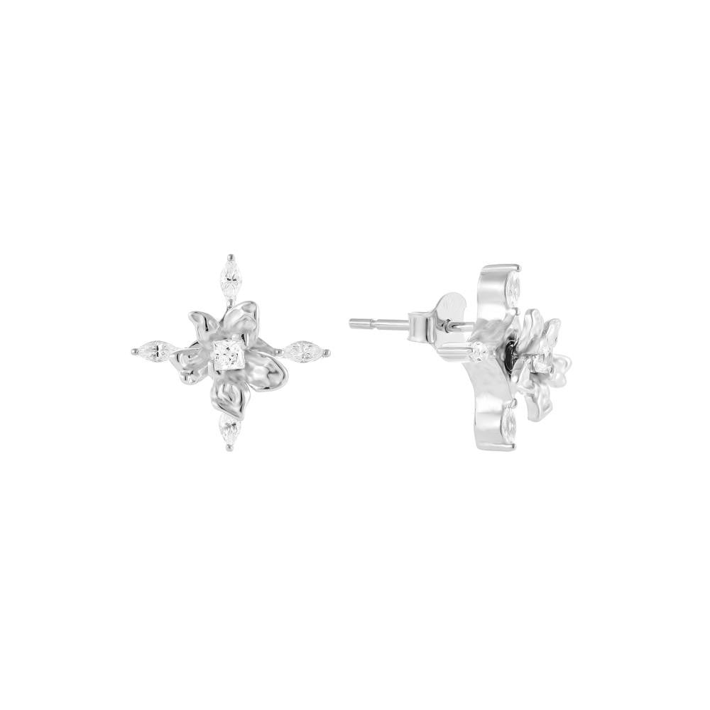 At the centerpiece, lies an orchid that spins with elegance, its princess cut stone gleaming against a backdrop of 4-pointed marquise stones. These earrings are a dance of light and texture, a constellation of beauty.