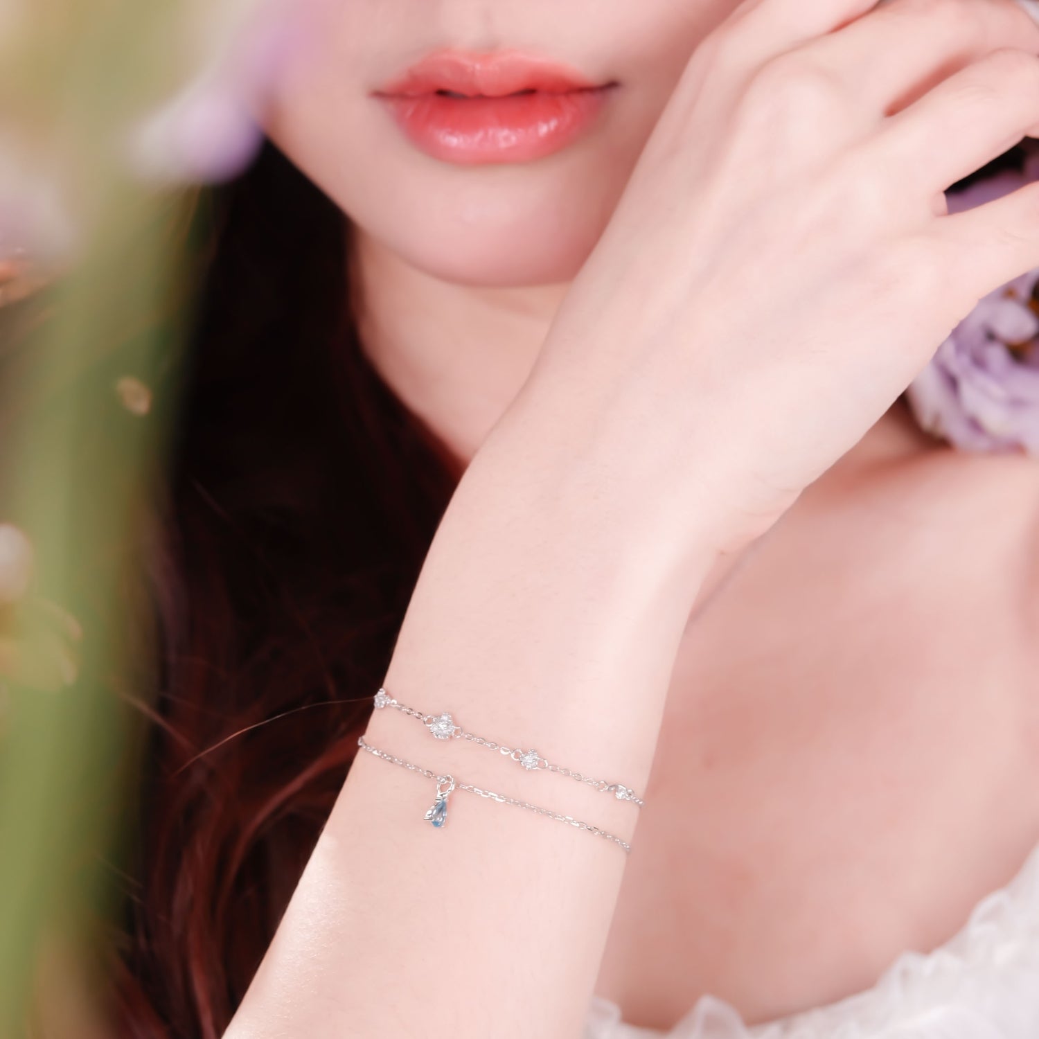 Tiny petals scatter along the first chain, delicate and light as the drifting petals. The second strand carries a tear drop topaz and a single Butterfly Blue Pea charm — a bloom of indigo steeped in stories and soul.