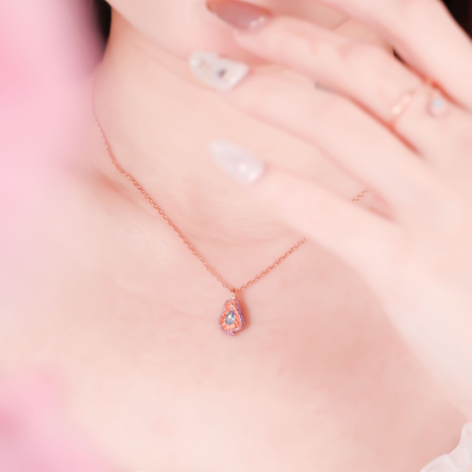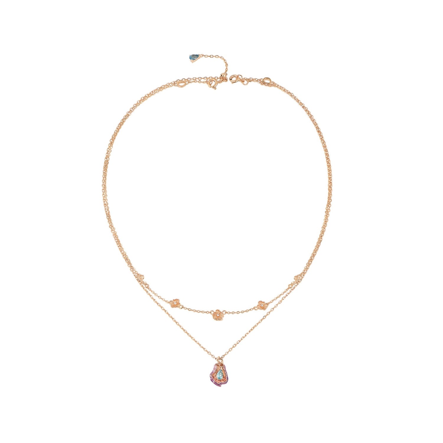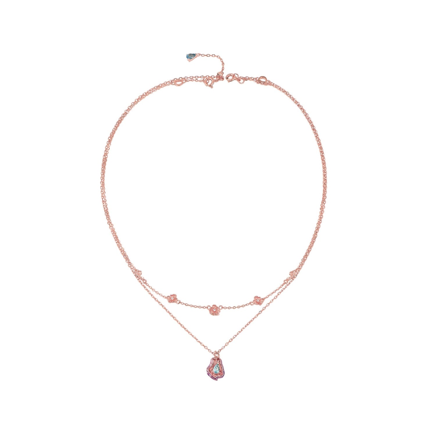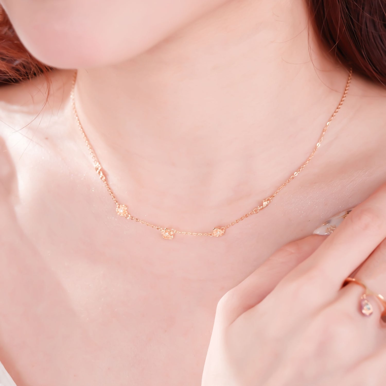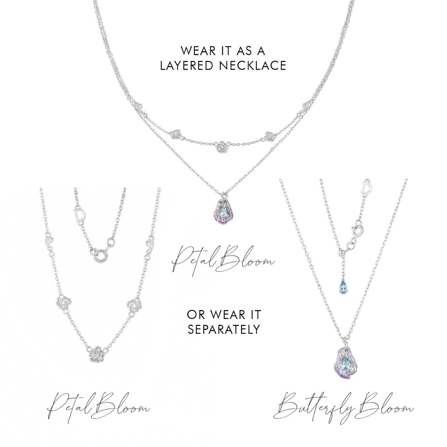 The first necklace dances at the top of your heart, where dainty petals drift like falling confetti from a garden.