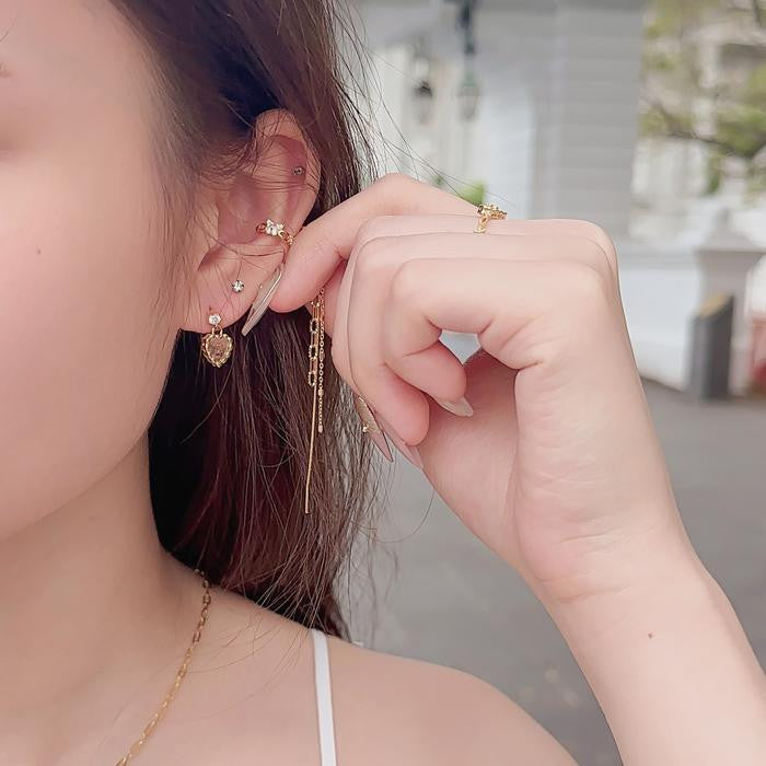 Connect the earring to the ear cuff to create a whimsical, dangling style along the earlobe. The cuff, adorned with a butterfly, brings your heart to freedom as you embark on a journey of self-discovery. For that extra touch of whimsy, add the sparkling drop-dangling chain, allowing sparkles to flow gracefully with every enchanting movement.