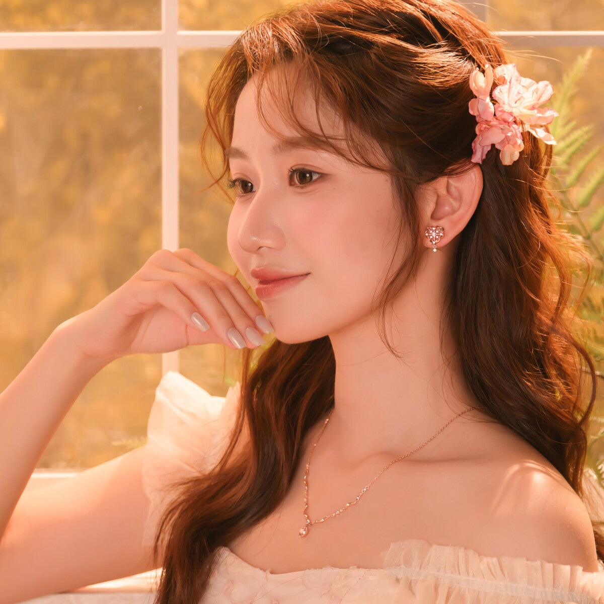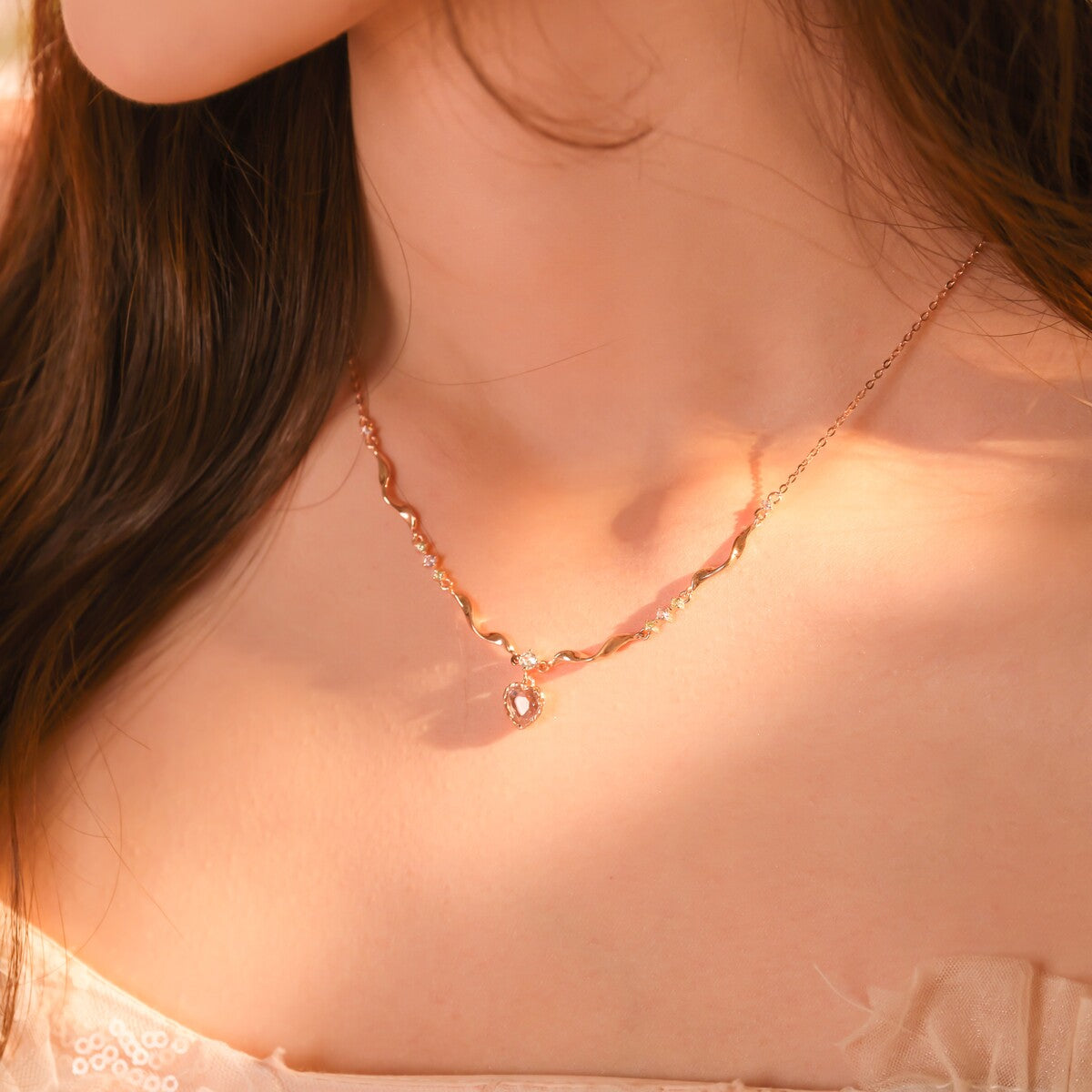 At the heart of this necklace hangs a pink heart charm, dropping softly from a twinkling stone. The heart is wrapped in a frame of wavering texture that echoes the journey we’ve come so far.