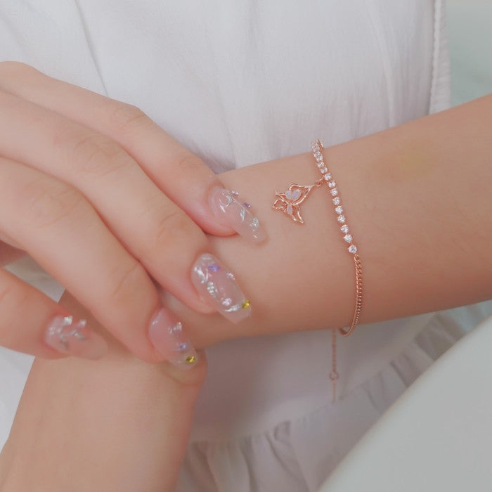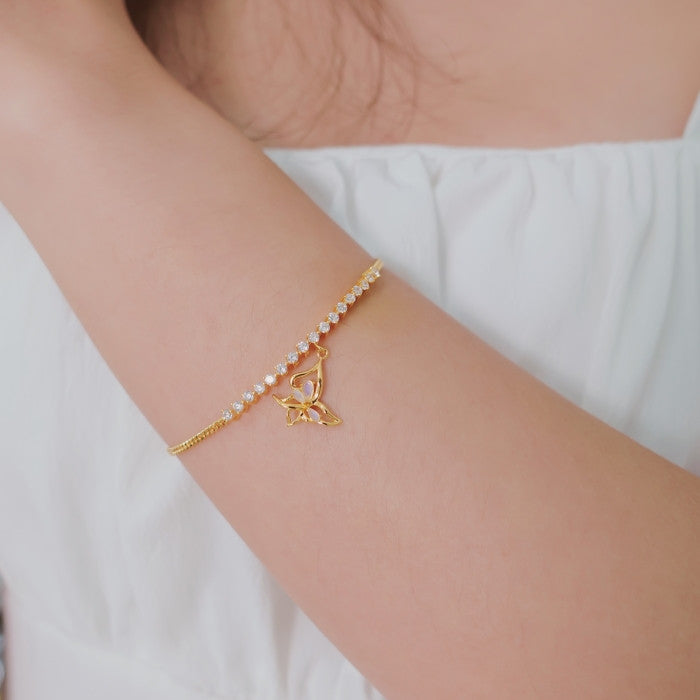 Feel the flutters from a delicate row of butterfly sparkle links embellished with moonstone gemstone. It's a piece that reminds us of the wonder of precious moments and the magic that surrounds your heart. This bracelet serves as a reminder that, like a butterfly, every moment is fleeting but carries an enduring sense of joy and enchantment.