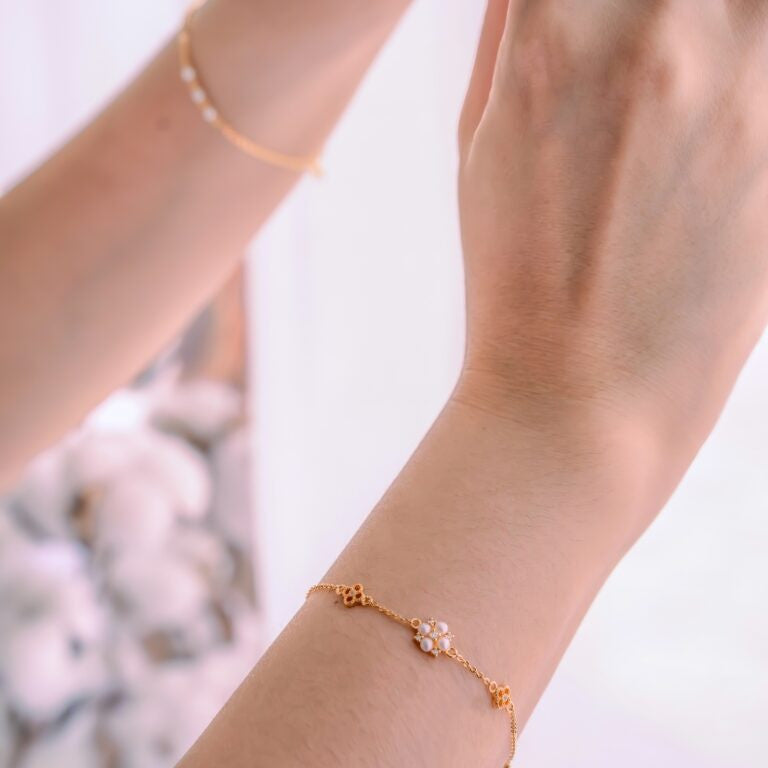 Wrap your wrist in the tender elegance of the Swiftlet Bracelet, where every chapter tells a story of love and devotion. Nestled within the centerpiece, four pearls gleam with the purity of a mother’s affection, encircled by stones that sparkle like stars in the night sky, a beacon of protection guiding you through the journey of motherhood.