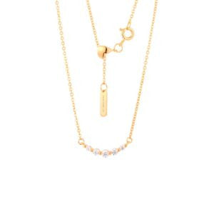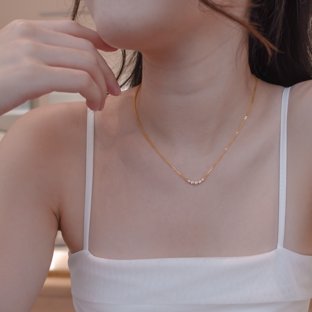Be enchanted by the beauty of sparkles in Talia necklace. Round cut stones lining up in a curve helps to accentuate your neckline.